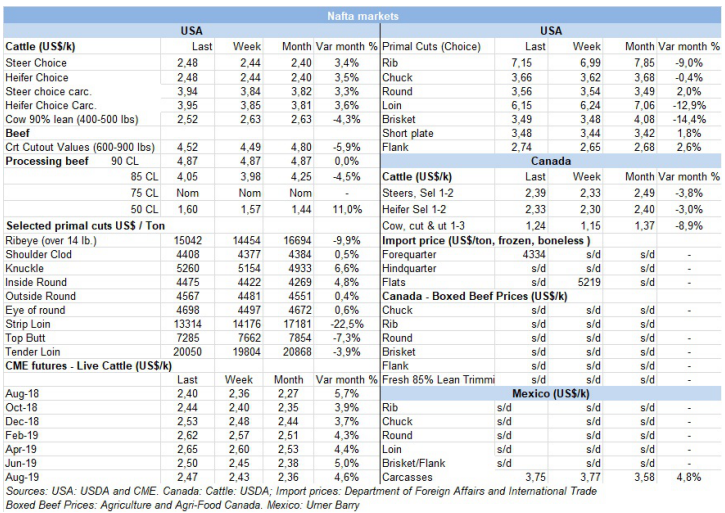 本周各國貨幣尤其是巴西雷亞爾增值,使閹牛價格上漲,南方共同市場閹牛指數(shù)上漲5美分到2.69美金。巴西雷亞爾對美金增值2.5%,部分原因是總統(tǒng)候選人Geraldo Alckmin受歡迎度很高,10月大選前景比較被看好,而且本地牛價也增加了0.3雷亞爾/公斤,綜合起來育肥牛價格漲了7美分到2.41美金,9周以來最高。烏拉圭閹牛價格由于供應(yīng)緊缺也漲了,阿根廷牛價穩(wěn)定,貨幣也穩(wěn)定,連續(xù)四周價格不變,巴拉圭由于處于口蹄疫接種時期,市場比較平靜,牛價保持不變。