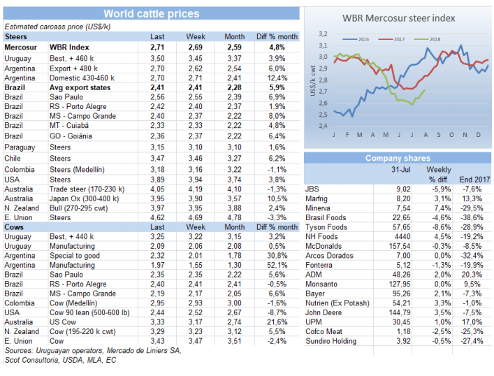 南方共同市場閹牛指數(shù)本周漲了2美分到2.71美金,12周以來最高,本周阿根廷,烏拉圭和巴拉圭牛價(jià)都上漲,巴西保持不變。阿根廷近期牛價(jià)又開始強(qiáng)勁上漲,本周漲了2比索,換算成美金價(jià)漲了8美分至2.7美金,比6月中最低的2.43美金高了很多,巴拉圭和烏拉圭供應(yīng)短缺也促使牛價(jià)上漲。巴西本地牛價(jià)微漲,但被貨幣的小幅貶值抵消了。