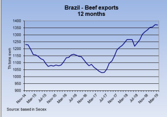 預(yù)計2019年阿根廷活牛存欄量會保持在5380萬頭,能繁母牛預(yù)計2360萬頭,比2018年略低,母牛屠宰量由于中國出價高而增加,新生牛犢數(shù)量將減少30萬頭。19年屠宰量將達(dá)到1330萬頭,比去年略低,如果由于飼草生長良好育肥牛壓欄,飼育場會推遲出售給屠宰廠。今年牛肉產(chǎn)量預(yù)計會達(dá)到300萬噸,與18年持平,待宰牛均重增加。由于阿根廷比索貶值帶來的利好,牛肉出口量預(yù)計會達(dá)到58.5萬噸,比18年多7.7萬噸(15%),比17年翻倍,從18年8月到19年1月,65%的牛肉出口去到中國和香港,10%去俄羅斯,10%去歐盟,5%去智利。