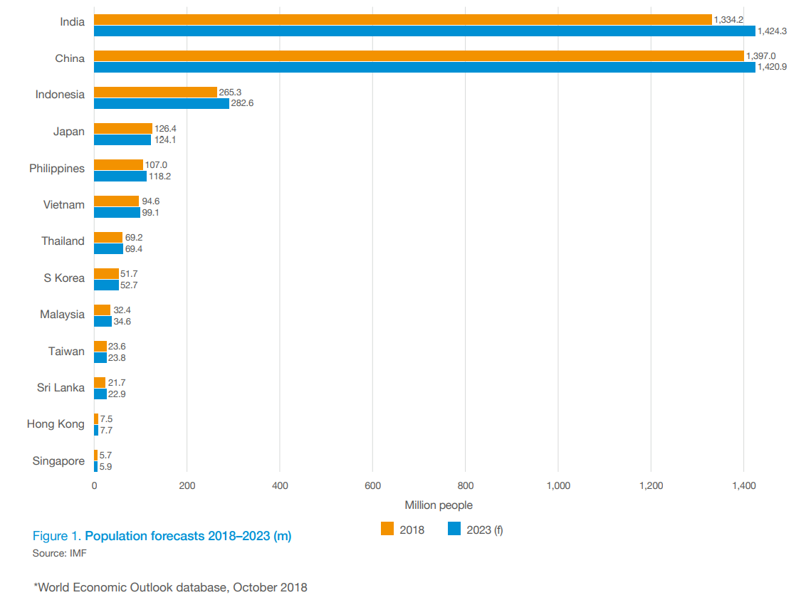 2009年全球中產(chǎn)階層18億人口,2020年預計達到32億人口,2030年預計達到49億人口,中產(chǎn)階層增長主要來自亞洲,約占全球中產(chǎn)的66%,占2030年中產(chǎn)階層消費總量的59%。人口只是分析市場潛力的一個因素,其他因素比如:收入增長和文化影響,可能更重要。盡管印度有望成為人口第一大國,但印度的肉類年人均消費僅3.3公斤,其他亞洲市場對于出口商來說更具吸引力。(圖一:2018-2023年人口預測(單位:百萬))