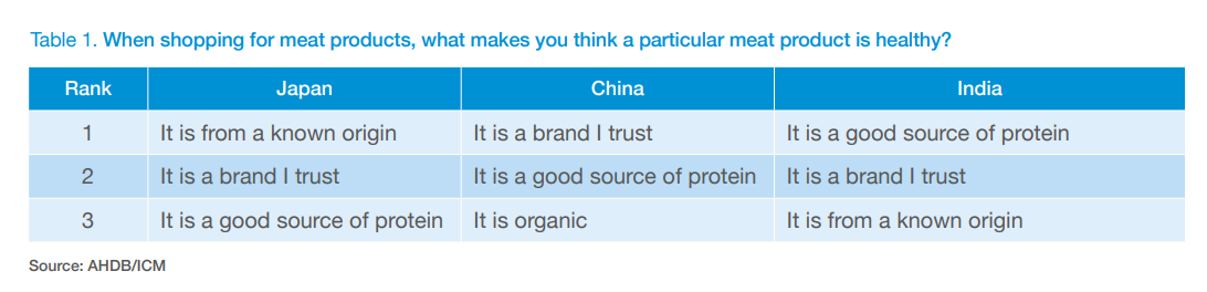 隨著生活水平和受教育程度提高,亞洲消費者越來越關(guān)心健康問題。與此同時,飲食結(jié)構(gòu)引發(fā)的慢性病越來越多,消費者更加注重食品對于健康的影響。超半數(shù)亞洲受訪者認為食品對健康的影響是選擇購買時的考慮因素。中國和越南將食品安全作為消費首要考慮因素。不到1/3的中國消費者和25%的日本消費者認為瘦肉更健康。中國和日本消費者對肥肉并不抗拒。但是,在日本女性消費者認為羊肉更健康。(圖三:選購食品——食品如何影響健康和福祉)(表一:選購肉類產(chǎn)品,哪種肉制品,你認為是健康的)