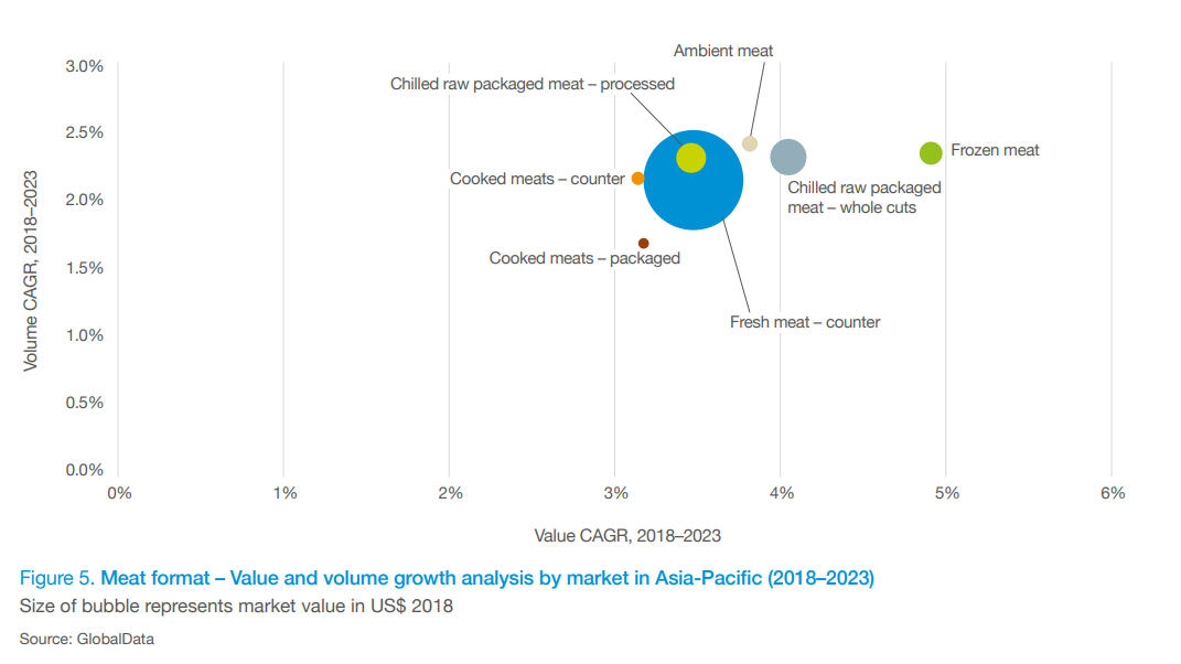 2017年AHDB調(diào)研結(jié)果顯示52%的日本受訪者選擇保質(zhì)期作為判斷肉品質(zhì)量的第一選擇。圖五圖表顯示冷凍肉無論是數(shù)量還是數(shù)額未來都將是增長幅度最大的。(圖五:2018-2023年肉類結(jié)構(gòu):亞太地區(qū)市場數(shù)額和數(shù)量增長分析)