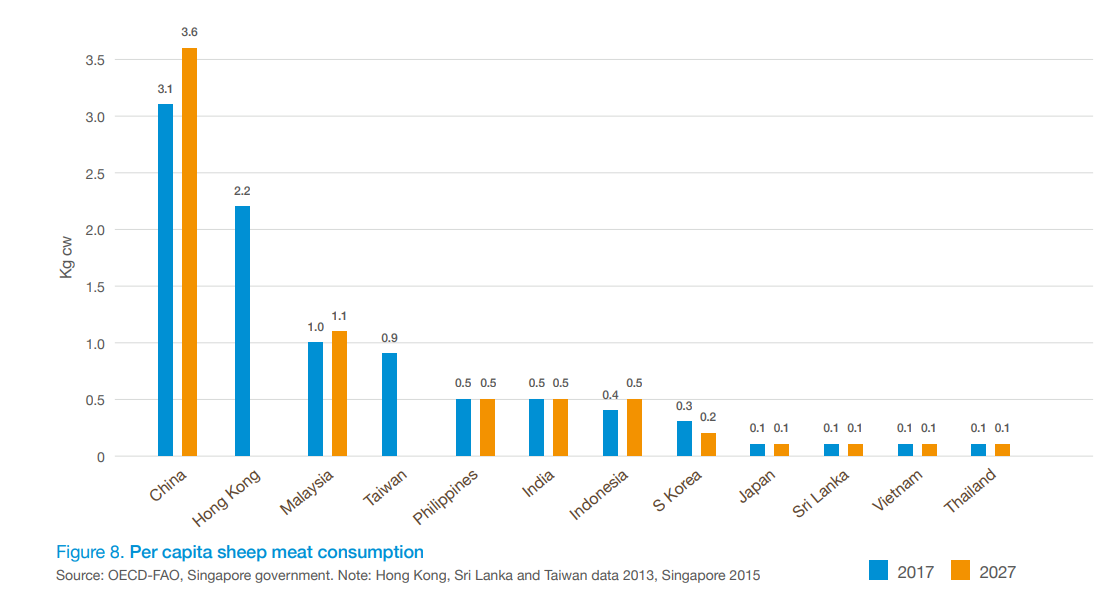 到2027年預計越南豬肉和牛肉消費增長幅度最大,中國羊肉消費增長幅度最大。(圖六-八:豬肉/牛肉/羊肉人均消費量)