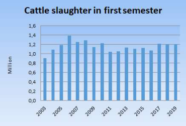 前幾周大雨泛濫導(dǎo)致屠宰量減少,本周有所恢復(fù),截止到6月29日這周共屠宰35712頭牛,比前一周多2902頭,但同比減少了11%,屠宰量的恢復(fù)主要發(fā)生在母牛,母牛屠宰量15049頭,比前一周多3717頭,即33%,而閹牛和小母牛屠宰量都減少了500多頭。6月總共只有157135頭牛被屠宰,同比減少近2.9萬(wàn)頭,四月和五月的高屠宰量節(jié)奏已經(jīng)結(jié)束。2019年上半年總共屠宰120.2萬(wàn)頭,和前兩年幾乎一樣。