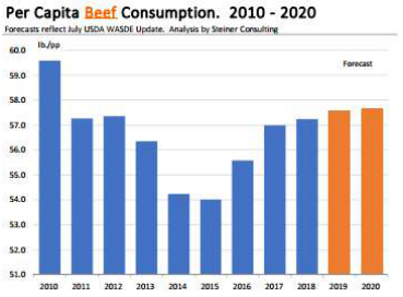 USDA在六月存欄報告出來之后對供應(yīng)/需求平衡表做了微調(diào),2019年預(yù)測牛肉產(chǎn)量調(diào)低了7500萬磅,主要原因是平均胴體重量比預(yù)期低,并且第三季度屠宰量也有下行的趨勢。產(chǎn)量的減少會被需求端的調(diào)整抵消一部分,進(jìn)口量將增加1000萬磅,出口量會減少1000萬磅,此外人均牛肉消費量也被調(diào)低,僅會同比增長0.6%。不過USDA對2020年的預(yù)測數(shù)據(jù)并沒有進(jìn)行調(diào)整,而且雖然牛肉供應(yīng)量將減少,USDA還是把2019年閹牛價格預(yù)測調(diào)低了1.3%。