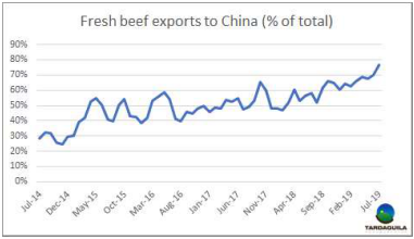 中食展期間的高需求量以及價(jià)格反映在了烏拉圭過去兩月的出口價(jià)格上,前四個(gè)月出口均價(jià)換算為胴體重量為3727美金/噸,而六七月均價(jià)達(dá)到4110美金,增長10%。另外中國市場進(jìn)口量占牛肉產(chǎn)量比例增長,前四個(gè)月占比52%,而六七月是59%。