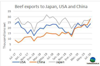 烏拉圭七月牛肉出口量降到2017年十月來最低水平,僅22699噸,其中冷凍牛肉20926噸,中國市場占比越來越高,共進(jìn)口17443噸,占冷凍牛肉83%,占總出口量77%,中國市場進(jìn)口總值占比也在增加。前七個(gè)月出口中國總量增長30%,均價(jià)上漲10%,今年均價(jià)4730美金/噸,還在繼續(xù)上漲,七月均價(jià)達(dá)到了5147美金,其中帶骨牛肉均價(jià)3427美金/噸,同比上漲12%。