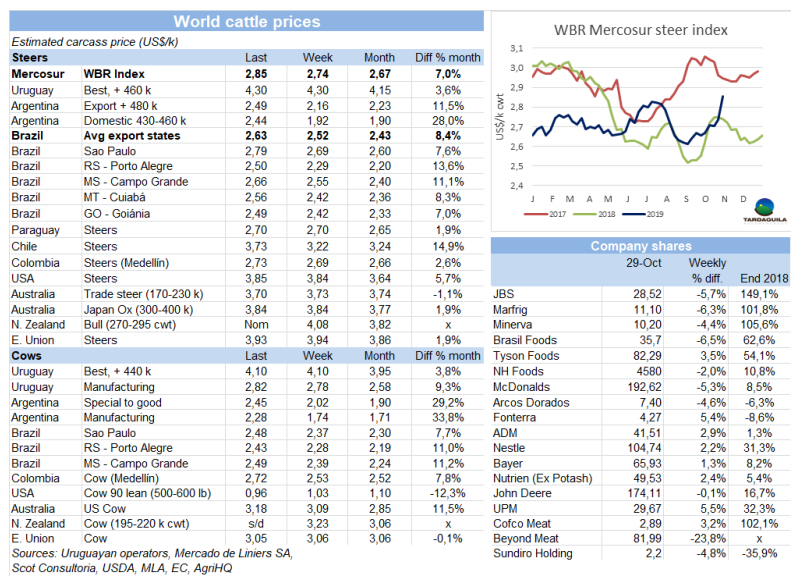南方市場(chǎng)閹牛平均價(jià)格從2018年4月起達(dá)到最高水平。世界牛肉周報(bào)南方閹牛胴體價(jià)格增長(zhǎng)了11美分,增長(zhǎng)至2.85美元/公斤。上漲有多方面原因。最為顯著的是阿根廷價(jià)格的上漲,周日反對(duì)黨在大選中勝出時(shí),報(bào)盤(pán)數(shù)量立刻達(dá)到最低,官方對(duì)貨幣兌換進(jìn)行了嚴(yán)格控制。阿根廷出口閹牛價(jià)格增長(zhǎng)了33美分,增長(zhǎng)至2.49美元/公斤,包含進(jìn)口稅。巴西育成公牛增長(zhǎng)也很強(qiáng)勢(shì),雷亞爾價(jià)格漲了2.1%,每15公斤牛肉價(jià)格增長(zhǎng)了3雷亞爾。因此在巴西主要的出口州育成公牛平均價(jià)格本周增長(zhǎng)11美分,增長(zhǎng)至2.62美元/公斤。烏拉圭和巴拉圭的市場(chǎng)參考價(jià)本周保持不變,烏拉圭價(jià)格4.3美元/公斤,巴拉圭2.7美元/公斤。