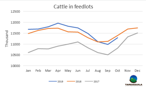 10月美國(guó)農(nóng)業(yè)局牛只存欄報(bào)告沒(méi)有巨大變化,10月1日飼育場(chǎng)存欄1130萬(wàn)頭,比一年前下降1.1%,這是年度對(duì)比中第二個(gè)存欄總數(shù)連續(xù)減少月。9月補(bǔ)欄總計(jì)209萬(wàn)頭,比2018年高2%,9月賣(mài)到市場(chǎng)的牛只共174萬(wàn)頭,比2018年增長(zhǎng)1%。2019年比去年多一天交易日。8月12個(gè)月平均存欄1160萬(wàn)頭,存欄量比上兩個(gè)月有輕微下降。