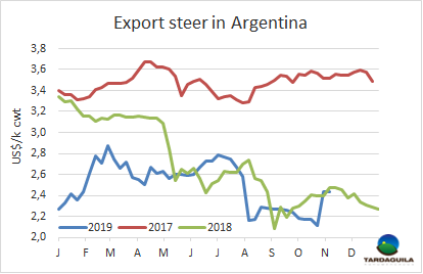 大選結(jié)果確定和貨幣兌換管控過后閹牛價格穩(wěn)定。英國純種閹牛報價140-145比索/公斤,印度串種閹牛報價136-140比索/公斤,母牛價格上漲趨勢受中國需求影響,價格上漲至優(yōu)種閹牛水平:特種和良種母牛報價140-145比索/公斤,工業(yè)母牛報價125-130比索/公斤。
