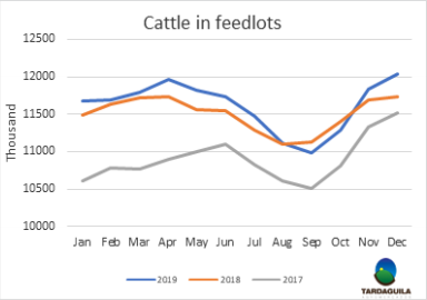 2019年12月1日,美國(guó)屠宰市場(chǎng)存欄能力1000頭及以上的飼育場(chǎng)牛只存欄總計(jì)約1200萬(wàn)頭,比2018年12月1日增長(zhǎng)2%。11月補(bǔ)欄209萬(wàn)頭,比2018年增長(zhǎng)5%,凈增203萬(wàn)頭。11月出欄總量181萬(wàn)頭,比2018年減少3%,11月掉頭數(shù)量6.5萬(wàn)頭,比2018年減少了19%。