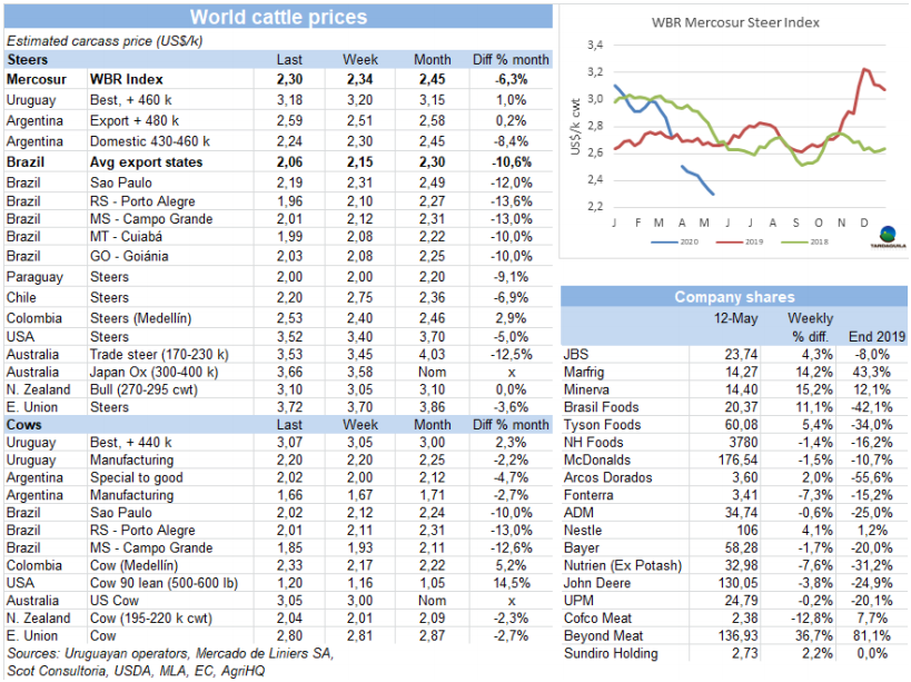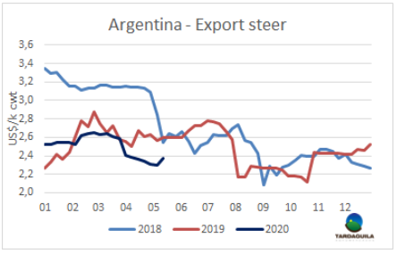 本周南方共同市場閹牛平均價(jià)格再次下跌,自2月中起連續(xù)12周保持下行趨勢,期間胴體價(jià)格下跌69美分,下跌了23%。閹牛價(jià)格指數(shù)下降至2.3美元/公斤,較7天前下跌4美分。本周巴西貨幣貶值仍是主導(dǎo)因素,本周雷亞爾貶值5%,兌美元匯率5.87,巴西育成牛胴體價(jià)格下跌9美分,下跌至2.06美元/公斤,另一個值得一提的國家是阿根廷,趨勢相反,本周出口閹牛價(jià)格上漲8美分,上漲至2.59美元/公斤,烏拉圭和巴拉圭價(jià)格變動不大。