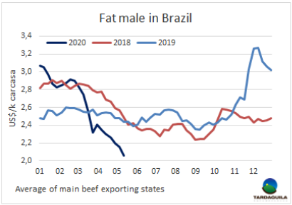 與出口到國內(nèi)市場的工廠相比,直接出口到中國市場的肉類加工廠要多花10雷亞爾采購出口至中國的適齡牛(30個月齡以下),這反映了出口相對于國內(nèi)需求的卓越競爭力。這主要是由于雷亞爾疲軟,昨天雷亞爾兌美元匯率為5.87。在上周日母親節(jié)(通常在每個月的月初)出現(xiàn)額外需求之后,巴西國內(nèi)市場對牛肉興趣不大,新冠疫情危機(jī)中,消費(fèi)者趨向于選擇更便宜的蛋白質(zhì)。圣保羅育成牛參考價(jià)193雷亞爾/15公斤,較上周下跌1美分。預(yù)定時間拉長至9天左右,其他州,例如米納斯吉拉斯,預(yù)定時間拉長至11天。不同地區(qū)價(jià)格走勢不同,戈亞尼亞州價(jià)格有回漲,參考價(jià)在178.5雷亞爾/15公斤。