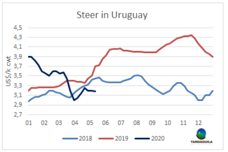 上周牛只屠宰量再次增長,保持從四月前半月開始逐漸恢復(fù)的趨勢。截止5月9日的一周,牛只屠宰量42390頭,周屠宰量較前一周增長了6300頭,包含5月1日的假期,較截止4月25日的一周屠宰量增長2000頭。上周屠宰量的主要增長的是閹牛,因?yàn)闉?span>481配額準(zhǔn)備的牛只已經(jīng)運(yùn)抵工廠,但是由于歐洲市場不樂觀,將出口至不同的市場。閹牛屠宰量19942頭,較前一周增長25%,增長了4000頭。母牛屠宰量16919頭,小母牛屠宰量4564頭,均較前一周增長超過10%。屠宰量最大的工廠是 Marfrig-Tacuarembó (4023頭),NH-BPU(3765頭),Athena-Carrasco (3759頭)。Marfrig上周屠宰量11918頭,較前一周增長約1000頭,美麗華兩家工廠屠宰總量7501頭,達(dá)到兩年前屠宰量水平。