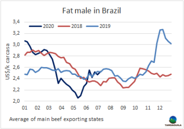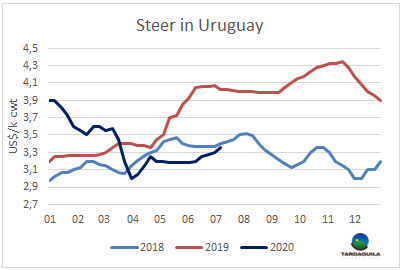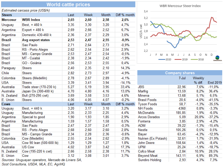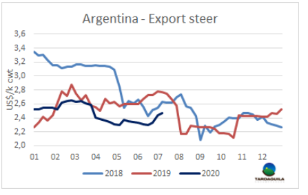 南方共同市場四國待宰牛平均價格連續(xù)第二周上漲。南方市場閹牛價格指數(shù)上漲了5美分,上漲至2.65美元/公斤,達三月中旬疫情在南美爆發(fā)以來最高。漲幅在3-6美分,受當(dāng)?shù)乩讈啝杻r格上漲拉動,盡管匯率漲了1.5%,巴西主要出口州育成牛價格上漲6美分,上漲至2.53美元/公斤。烏拉圭和巴拉圭牛價上漲5美分,烏拉圭牛價在南美地區(qū)最高,達3.3美元/公斤。巴拉圭牛價是南美地區(qū)最低,2.4美元/噸。阿根廷出口閹牛價格上漲3美分,上漲至2.69美元/公斤胴體價,包含9%的牛肉出口稅。