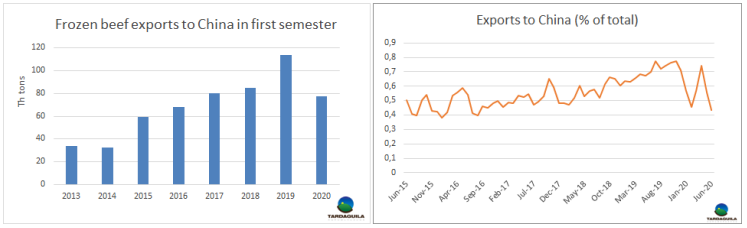 上一季度冰鮮牛肉出口量較冷凍牛肉出口量下降幅度更大,歐洲、巴西、智利等冰鮮牛肉的傳統(tǒng)市場受新冠疫情影響,需求大幅下降。4-6月,烏拉圭冰鮮牛肉出口量6053噸,同比減少36%,冷凍牛肉出口量64420噸,同比減少18%。烏拉圭出口商正在尋找其他替代市場。在過去的一個季度,到北美和亞洲的出口量顯著增加。出口至北美市場898噸,是2019年同期338噸的兩倍多。到亞洲出口量增加了近150%,達814噸,其中出口至日本566噸,出口至中國248噸。過去兩個月,冰鮮牛肉到中國出口量已經(jīng)從很少增長至每月5柜。本季度出口到中國的冰鮮牛肉平均價格5685美元/噸,而冷凍牛肉平均價格為4561美元/噸。