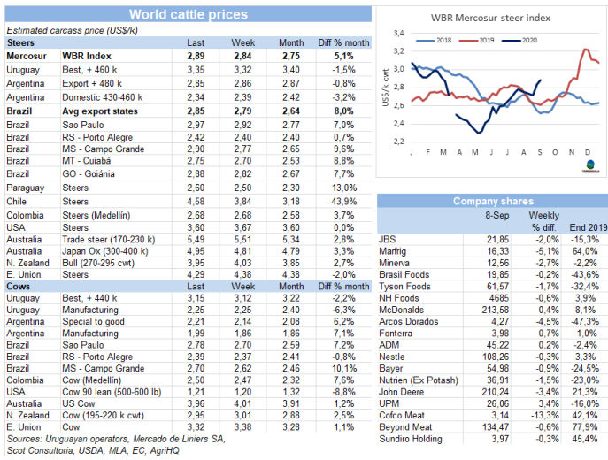 智利牛肉旺季(也就是九月國(guó)慶節(jié)假日)開(kāi)始前的一周,巴拉圭的發(fā)運(yùn)有一些延誤。由于疫情防控采取了隔離措施,目前尚不清楚需求量會(huì)有多大。牛肉消費(fèi)量下降,豬肉和家禽等價(jià)格更低的蛋白質(zhì)占據(jù)了智利市場(chǎng)。
