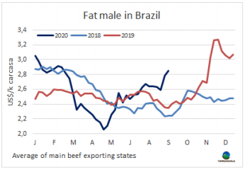 八月巴西牛肉對(duì)歐洲出口量繼2019年11月至今10個(gè)月以來(lái)首次達(dá)5000噸。這一貿(mào)易量是自五月低點(diǎn)以來(lái)連續(xù)第三個(gè)月增長(zhǎng)。今一月至八月對(duì)中國(guó)出口量下降了23%,下降至30307噸。