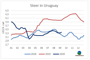 過(guò)去兩周,烏拉圭牛肉在美國(guó)市場(chǎng)的表現(xiàn)與預(yù)期脫軌。美國(guó)國(guó)內(nèi)牛肉產(chǎn)量旺盛,抑制了進(jìn)口業(yè)務(wù)的興趣,甚至連還價(jià)都沒(méi)有收到。此外,隨著氣溫的下降,美國(guó)餐飲的牛肉銷售開(kāi)始放緩。