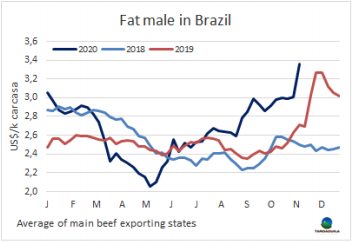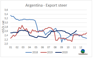 全球經(jīng)濟(jì)發(fā)展情況樂觀促使新興國家貨幣大幅升值,南方共同市場(chǎng)閹牛平均價(jià)格隨之上漲。輝瑞公司宣布新冠疫苗的有效性高達(dá)90%,拜登在美國大選中獲勝,預(yù)期對(duì)中國的敵意將被擱置,改善了市場(chǎng)情緒。股市指標(biāo)大幅上升,包括雷亞爾在內(nèi)的新興國家貨幣也大幅上升。本周巴西貨幣兌美元升值6%。巴西待宰牛供應(yīng)仍然十分緊缺,按雷亞爾價(jià)格繼續(xù)上漲。貨幣升值和本地牛價(jià)上漲拉動(dòng)主要出口州育成牛價(jià)格暴漲36美分,上漲至3.36美元/公斤,達(dá)南美地區(qū)牛價(jià)最高。圣保羅育成牛價(jià)格本周上漲33美分,上漲至3.48美元/公斤。阿根廷和巴拉圭待宰牛價(jià)格也有上漲,盡管歐洲市場(chǎng)需求弱,阿根廷出口閹牛價(jià)格上漲了8美分,達(dá)2.87美元/公斤(包含出口稅),巴拉圭牛價(jià)上漲至2.95美元/公斤。南美地區(qū)唯一一個(gè)價(jià)格下跌的國家是烏拉圭,2018年5月以來,烏拉圭牛價(jià)第一次不再是南美地區(qū)最高,下降了3美分,達(dá)2017年以來最低。南方共同市場(chǎng)閹牛價(jià)格上漲了22美分,上漲至3.18美元/公斤。