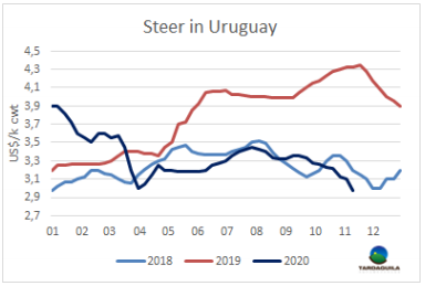 烏拉圭育成閹牛價(jià)格2017年年末以來首次達(dá)3美元/公斤的低點(diǎn)