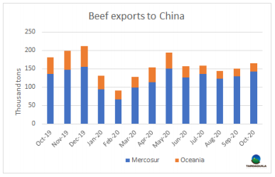 以南方共同市場(chǎng)為主的南美產(chǎn)品在中國進(jìn)口牛肉市場(chǎng)的份額持續(xù)上升。10月南美地區(qū)牛肉出口量出口了14.3萬噸,估計(jì)從阿根廷進(jìn)口4.5萬噸,較9月增加1.3萬噸。澳大利亞和新西蘭對(duì)中國的出貨量增加了不到1000噸,達(dá)21417噸。與去年10月相比,南方共同市場(chǎng)對(duì)中國出口量增長了5%(6565噸),而澳洲對(duì)中國出口量下降52%,減少了2.3萬噸。