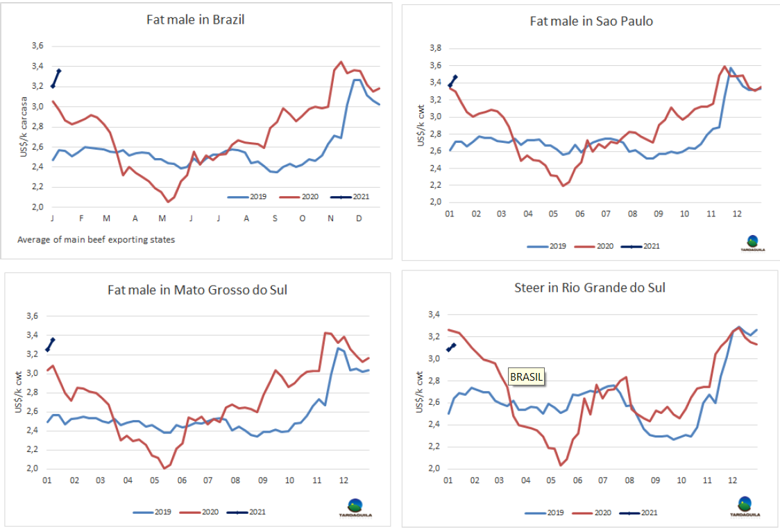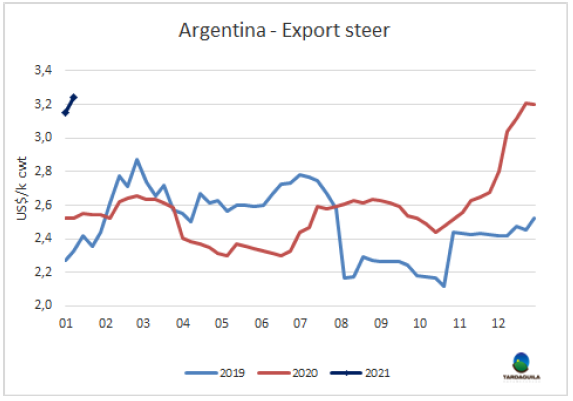 育成牛價格連續(xù)11周累計上漲了31%之后,在年初價格小幅下跌,預計出口活牛價格將繼續(xù)下跌。一方面由于出口稅的原因,1月份通常比在12月份更方便生產(chǎn)商銷售,另一方面國內(nèi)需求受隔離影響減弱和一些國際市場尤其是歐洲市場的困難。然而,在沒有明確的理由支持這種復蘇的情況下,牛價又恢復了上漲的趨勢。最好的英國純種閹牛價格下上漲了10比索,至270-280比索/公斤,串種閹牛價格上漲了10-15比索至265-275比索/公斤,特優(yōu)母牛價格保持232-242比索/公斤,主要出口至中國的工業(yè)母牛價格上漲了2-4美分,215-218比索/公斤。