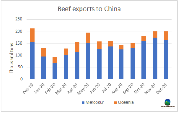 根據(jù)主要出口國的出口數(shù)據(jù)和阿根廷的預估出口數(shù)據(jù),12月全球兩大主要供應商南美和澳洲對中國出口量保持20萬噸,與11月水平相當。11月和12月出口數(shù)據(jù)的差異在于澳洲的出口量占比增大,尤其是來自新西蘭的出口量,新西蘭出口量約2萬噸,達2019年12月以來最大。新西蘭的出口量增加是由于船期變短了。因為這些產(chǎn)品需在春節(jié)前到港。目前,南美目前的大部分12月裝船的產(chǎn)品很難趕上春節(jié)到港。南美對中國出口量約達16.3萬噸,較11月減少了1萬噸。12月澳洲對中國牛肉出口量3.5萬噸,較11月增長了9%。12月這兩個地區(qū)的出口量較2019年12月下降了12%,盡管南美地區(qū)對中國出口量增長了7%,也沒能抵消澳洲對中國出口量同比2萬噸的下降。