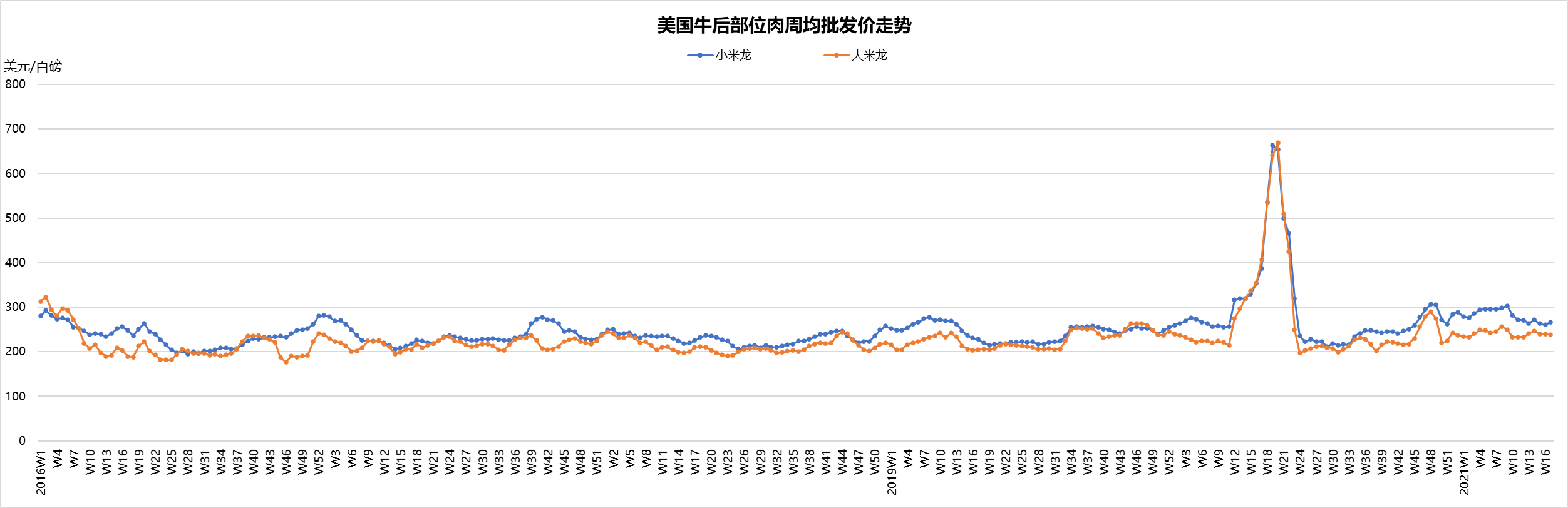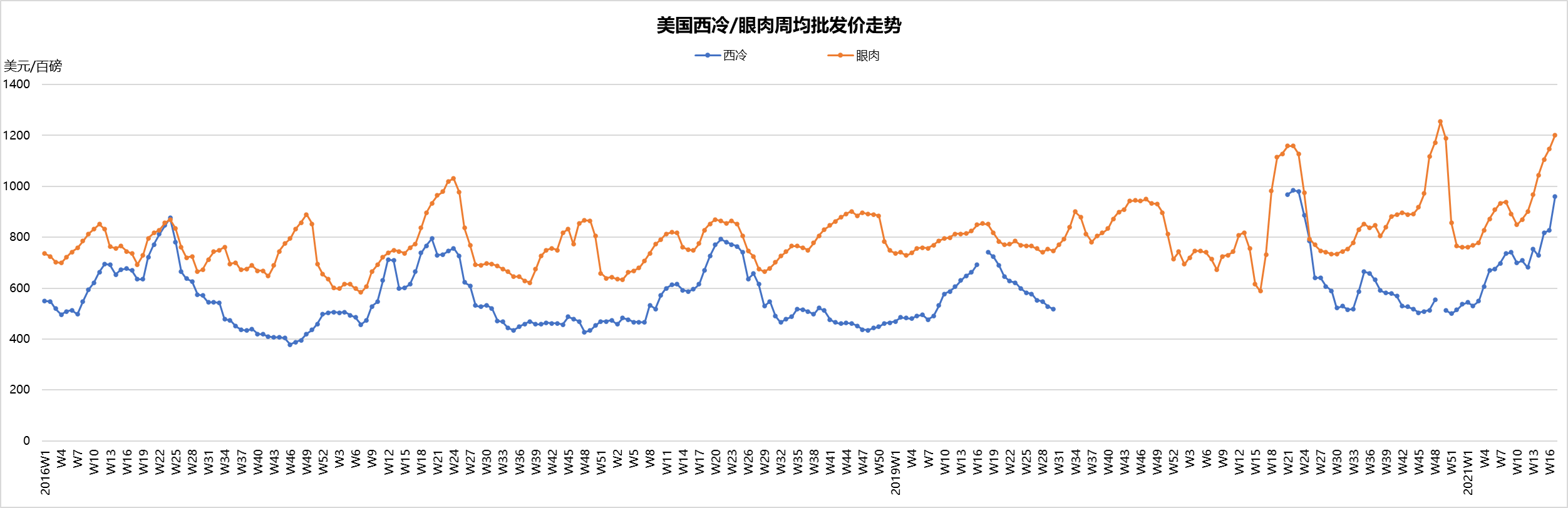 4月部位肉批發(fā)價(jià)保持堅(jiān)挺,精選級(jí)部位肉綜合價(jià)2.8美元/磅,較上周增長(zhǎng)了2.5%,較去年同期上漲了2.9%。去年受疫情影響部位肉批發(fā)價(jià)急劇上漲。餐飲的復(fù)蘇是最近部位肉價(jià)格上漲的主要原因。
