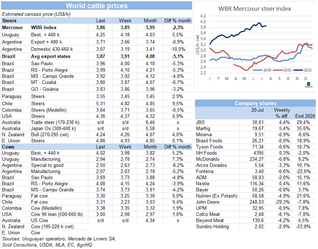 7月前17天,烏拉圭屠宰行業(yè)牛屠宰量達(dá)127297頭,較2020年同期增長了4萬頭(46%),據(jù)本月結(jié)束還剩兩周,預(yù)計(jì)2021年七月牛屠宰量將達(dá)歷年七月最高。截至目前只有兩各年度期月屠宰量超過20萬頭,1982年(歷史上最糟糕的一次經(jīng)濟(jì)危機(jī),以所謂的“匯率制度”的崩潰而告終)和1989年,當(dāng)時(shí)烏拉圭經(jīng)歷了嚴(yán)重的干旱,這兩年的屠宰量分別達(dá)到了20.1萬頭和20.3萬頭。今年如果接下來兩周的周屠宰量保持5萬頭以上,七月屠宰量將達(dá)22.5萬頭,將輕松超過以往的屠宰量記錄。記者問詢的工廠都一致認(rèn)為接下來兩周屠宰量將保持當(dāng)前節(jié)奏,一些工廠已經(jīng)備足了待宰牛,因此大概率七月屠宰量記錄將會打破。上周,盡管冬季來臨,據(jù)烏拉圭肉協(xié)報(bào)告統(tǒng)計(jì),上周牛屠宰量51754頭,較前一周增長了550頭,屠宰量連續(xù)第四周保持五萬頭以上,較去年同期增長了2萬頭以上,(+66%)。本周閹牛屠宰量繼續(xù)減少,母牛屠宰量增長。閹牛屠宰量較上周減少了9%至21398頭,母牛屠宰量增長了9%至22868頭,母牛屠宰量較去年同期有突出的增長。屠宰量最大的工廠是Las Piedras(4475頭),Athena-pulsa(4384頭),Carrasco(4079頭)。Marfrig四家工廠屠宰總量14019頭,較上周下降了700頭, 從這周起,Colonia廠所有員工開始休假,因此接下來四周Marfrig僅有三家工廠進(jìn)行屠宰活動。Athena工廠屠宰下降了約400頭至12402頭。