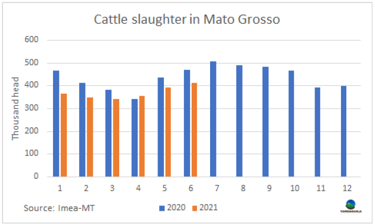 今年前半年巴西活牛存欄最大的州馬托格羅索州牛屠宰量下降了29.2萬頭至222萬頭,下降了11.6%。6月該州牛屠宰量41.2萬頭,盡管較五月屠宰量增長了2萬頭,是今年最大的月度牛屠宰量,與去年同期相比仍下降了12.5%。因?yàn)榘臀鞔鏅谥亟ǔ掷m(xù),屠宰量的下降主要表現(xiàn)在母牛上,6月馬托格羅索州的母牛屠宰量16.2萬頭,較2020年6月下降了21.2%,因此今年前半年馬托格羅索州母牛屠宰量達(dá)94.4萬頭,同比下降了19.6%。