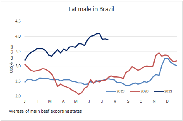 截止七月16日的前半月,巴西出口牛肉89237噸,平均出口價(jià)格5392美元/噸,日平均出口量7436噸,如果接下來兩周保持這一出口節(jié)奏7月出口量將超過16萬噸,達(dá)去年11月以來最大月度出口量。
