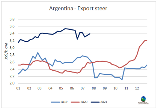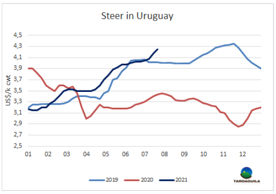 6月閹牛類型價(jià)值1261美元/頭,較上月增長了65美元,達(dá)2020年1月至今17個(gè)月以來的最高。烏拉圭肉協(xié)報(bào)告稱本月閹牛類型價(jià)值增加的原因是出口部位肉價(jià)格上漲和國內(nèi)市場胴體價(jià)格、副產(chǎn)品和鮮皮價(jià)格上漲。活牛采購價(jià)格上漲了37美元/頭,因此兩者的價(jià)差工業(yè)增加值增長了29美元至214美元,工業(yè)增加值增長了1.5%至17%,如果價(jià)值低于20%,則認(rèn)為該行業(yè)很難實(shí)現(xiàn)正利潤。