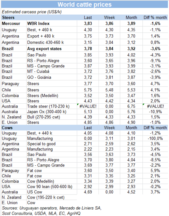 南方共同市場閹牛價格指數(shù)連續(xù)第二周上漲,本周下降了3美分至3.83美元/公斤。巴西牛價疲軟下跌,烏拉圭牛價穩(wěn)定,阿根廷和巴拉圭牛價穩(wěn)中有漲。