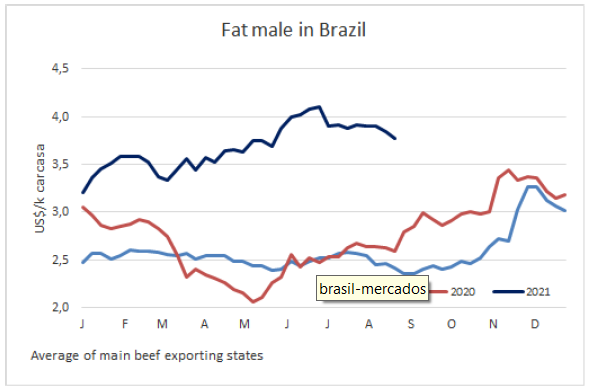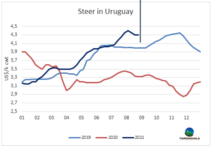 育肥牛市場保持下行趨勢,或?qū)⒊掷m(xù)數(shù)周。據(jù)被問詢的市場參與者反映,大多數(shù)工廠備貨充足,期貨采購時間拉長,有些工廠甚至開始買九月前10天的牛。這種情況下工廠壓價幾美分,只要生產(chǎn)者可以接受,價格會繼續(xù)下跌。本周用于出口的特種閹牛參考價4.3美元/公斤,國內(nèi)市場的閹牛參考價4.25美元/公斤,肉母牛4.05-4.15美元/公斤,牛供應(yīng)量仍很少,預(yù)計15天之后隨著天氣變化和烏拉圭南部的降雨來臨活牛供應(yīng)將增加。