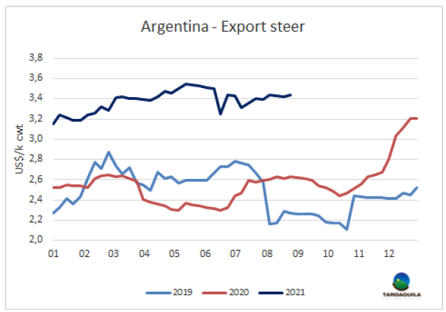 據(jù)阿根廷牛肉推廣局(IPCVA)基于國家統(tǒng)計和人口普查數(shù)據(jù)的一份報告,7月阿根廷牛肉出口量36113噸(相當(dāng)于約50600胴體重量),出口額約1.95億美元,不包括內(nèi)臟。7月出口量比6月下降了0.5%(這反過來表明出口庫存比5月暴跌了45%),出口量較2020年同期低33.4%。7月出口額較6月增長了22.6%,但與2020年7月相比同比下降15.2%。7月平均出口價格較上月上漲18%,較2020年7月上漲27.4%。上一個移動年阿根廷牛肉出口量達89萬噸。IPCVA表示,在上一個移動年(2020年8月至2021年7月),出口量接近89萬噸,出口額接近26.6億美元。僅在2021年前7個月,阿根廷牛肉出口量達到了334341噸,比去年同期增長近2%,其中76.6%出口到中國。今年前7個月阿根廷隊中國牛肉出口量增長了185%,而其他國家的牛肉出口量累計萎縮了85%。