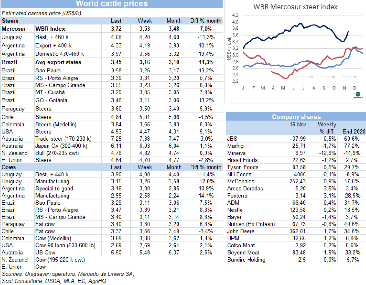 本周隨著巴西國內(nèi)市場需求對巴西育肥牛價格產(chǎn)生的積極作用,以及阿根廷和巴拉圭牛價上漲,南方共同市場閹牛價格指數(shù)反彈,較上周上漲19美分至3.72美元/公斤,達九月末以來最高。由于巴西國內(nèi)需求的改善和育肥牛供應的減少,巴西主要出口州育肥牛價格在一周內(nèi)上漲了29美分,達3.45美元/公斤。南美地區(qū)牛價還受到阿根廷和巴拉圭的拉動,阿根廷的供不應求導致活牛參考價上漲14美分至4.33美元/公斤,使阿根廷的牛價上漲至南美地區(qū)最高。巴拉圭方面對以色列的出口需求和降雨的到來使牛價從上周的下行開始有所回升,唯一一個牛價下行的國家是烏拉圭,上周由于工會罷工,草飼牛需求有所緩解,參考價約達4.08美元/公斤。