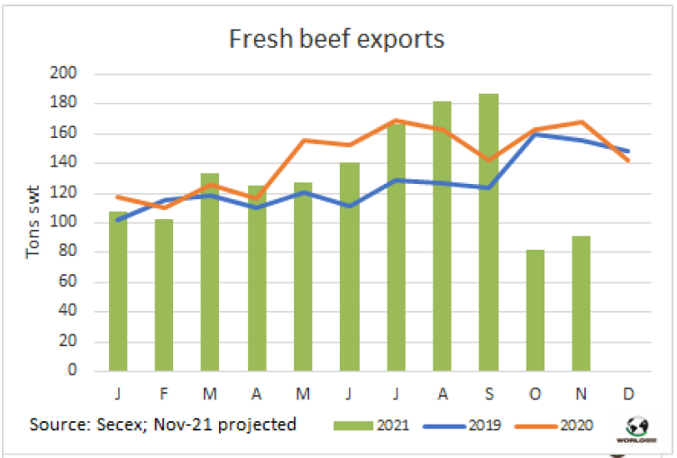 上周希爾頓臀肉出口價格急劇下跌,一系列因素給市場帶來不確定性。首先是歐洲市場對第四波疫情采取了新的管控,德國和荷蘭宣布了新的防疫限制措施,奧地利則選擇控制未接種疫苗的人口(超過30%),以遏制疫情的傳播。上周歐元走軟,人們猜測明年1月1日開放的下一個季度配額窗口會有大量481配額的牛肉進入。盡管阿根廷方面的報盤有限,成交價達13300-13800美元/噸離岸價。最近幾天由于工會罷工屠宰活動減少了很多。