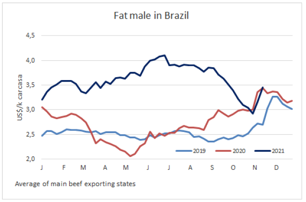 受11月前半月國內(nèi)市場銷售樂觀拉動,上周牛價急劇上漲。所有農(nóng)貿(mào)市場價格均有回漲,漲勢不均,圣保羅、米納斯吉拉斯、南馬托格羅索州的牛價一周內(nèi)上漲了10%-12%,馬托格羅索、隆多尼亞等地區(qū)牛價漲幅約6%-7%。圣保羅州活牛成交價300雷亞爾/15公斤, 9月中旬以后活牛成交價就從這一水平下滑。價格的回漲原因有供應和需求兩個方面。11月1日,巴西國內(nèi)需求持續(xù)回升,導致牛肉批發(fā)價格上漲7-8%。相反,活牛供應不充足,主要是因為育肥場大規(guī)模出欄的時期已經(jīng)過去。期貨市場牛價格有大幅上漲,2022年1月交貨的牛參考價超過320雷亞爾/15公斤,高于中國市場暫停以前的活牛市場價格。