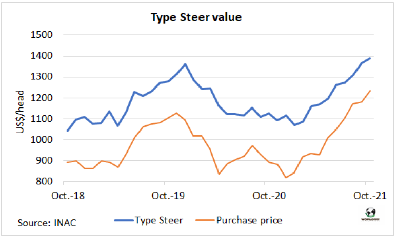 閹牛類型價值,是對牛肉工廠出售牛分割出的所有產(chǎn)品價格的加權(quán)估算,10月閹牛類型價值達歷史新高。據(jù)INAC的報告,閹牛類型價值平均1389美元,比9月增加了22美元,比去年同期增加了261美元(23%)。INAC稱這是因為“出口部位肉和國內(nèi)市場胴體價格的上漲”。相反,鮮皮、內(nèi)臟和副產(chǎn)品價值下降。相反,10月活牛采購價上漲了53美元/頭至1233美元/頭?;钆2少弮r與閹牛類型價值之間的差額(INAC稱之為工業(yè)增加值)本月減少了31美元至156美元,僅為閹牛類型價值的11.2%。