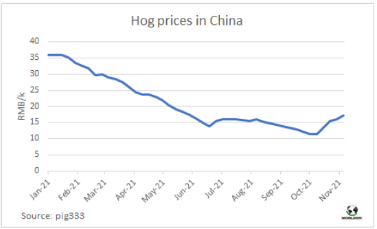 近五周內(nèi),中國毛豬價格已經(jīng)上漲近50%,從十月初的11.54元/公斤上漲至17.1元/公斤。盡管仍較年初水平低50%,這已經(jīng)是2021年截至目前第一個較大的反彈。