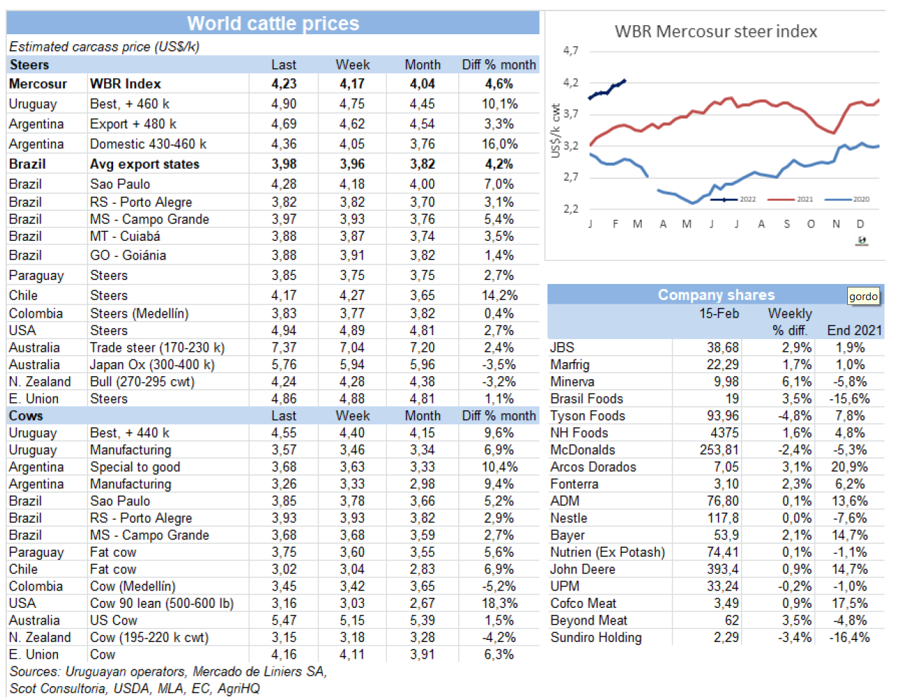 上周牛屠宰量保持高水平。烏拉圭肉協(xié)報道截止2月12日當(dāng)周牛屠宰量53653頭,較上周下降了300頭,同比去年同期增長了26%。閹牛屠宰量30058頭,較上周增長了10%,小母牛屠宰量急劇下降了31%至5818頭,母牛屠宰量16886頭,較上周下降了2%。屠宰活動最活躍的工廠是Las Piedras(379廠),屠宰量5,338頭, Ontilcor (439廠)屠宰量4,109頭, 其次是Marfrig-Tacuarembó(12廠) 屠宰量3,851頭。Marfrig四家屠宰廠屠宰量13602頭,較上周增長了725頭,美麗華三家屠宰場屠宰量9785頭,較上周下降了1022頭。2月前12天牛屠宰量共計98015頭,較2021年同期增加了2.1萬頭,增幅為21%。