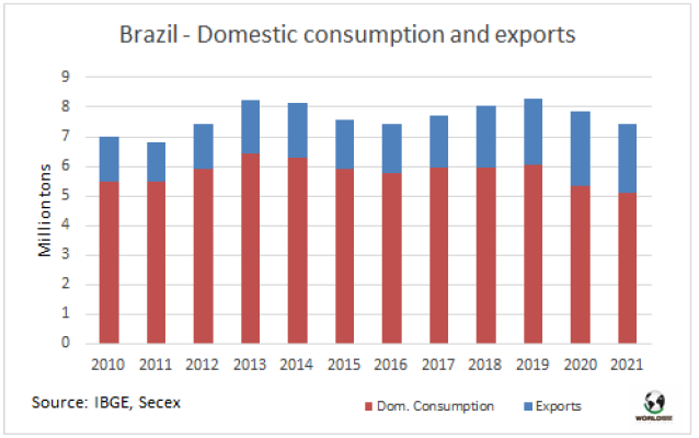 2021年巴西牛肉產(chǎn)量的減少對出口和國內(nèi)消費均產(chǎn)生影響。據(jù)估計,巴西去年人均牛肉消費量509萬噸(胴體重量),比2020年減少了27萬噸(-5.1%),是自2009年以來的最低水平。這一數(shù)字是基于IBGE發(fā)布的生產(chǎn)數(shù)據(jù)和外貿(mào)部的對外貿(mào)易數(shù)據(jù)報告。相反,如果考慮到人口的變化,檢驗機構(gòu)注冊的合規(guī)屠宰場(聯(lián)邦、州或市)生產(chǎn)的牛肉的人均消費量是自2004年以來首次降至24公斤以下。由于暫停對中國出口,今年最后一個季度的出口量急劇下降,這意味著海外銷售較去年的下降比例要大于國內(nèi)市場。出口量減少了7.0%至234萬噸,同比減少18萬噸(胴體重量)?!?span>