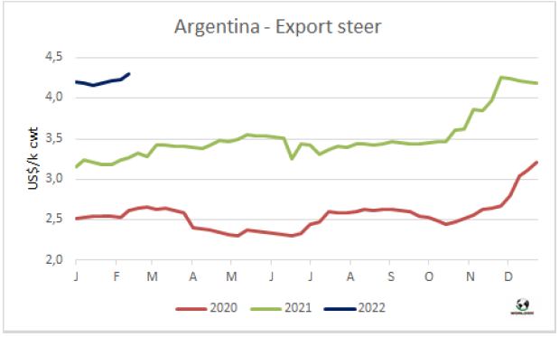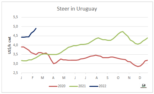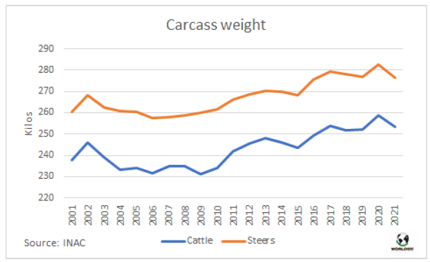 根據(jù)ABC出口商會的一份報告,去年待宰牛平均體重有所增加:母牛平均胴體重量為每頭210公斤,公牛的平均胴體重量為每頭246公斤,均高于2020年數(shù)據(jù)。對于ABC來說,由于“穆尼屠宰量減少和較輕動物數(shù)量減少”,平均體重為每頭228公斤,比2020年增長了2公斤。2022年的第一個月,這一數(shù)值再次被超越,達229公斤,盡管報告稱這 “與我們的競爭對手相比仍有很大差距”。