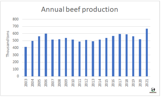 2021年創(chuàng)紀錄的牛屠宰量決定了牛肉產(chǎn)量大幅增長,達66.8萬噸,創(chuàng)歷史最高紀錄,同比增幅為28.7%。牛肉產(chǎn)量比2006年的最高紀錄高出6.9萬噸。牛屠宰量較2006年增加了不到5萬頭,增幅為1.9%,胴體重量增加了21.8公斤增幅約9.4%,因此牛肉產(chǎn)量比之前的記錄高出了11.5%。