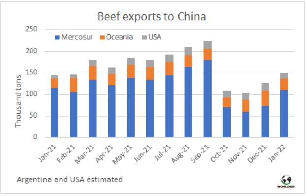 隨著2月中旬中國市場對巴西牛肉解禁,巴西對中國牛肉出口量穩(wěn)步增長。據(jù)估計,今年1月,南美洲、大洋洲和美國向中國出口了約15萬噸牛肉,比去年12月多出了約2.5萬噸,比去年11月多出了近5萬噸,而當(dāng)時巴西的牛肉供應(yīng)量幾乎為零。今年1月從南美市場發(fā)運的貨物約為11萬噸,由于巴西的重新回歸,較上月增加了3.7萬噸。澳大利亞和新西蘭1月的出口總量為25761噸,比去年12月的季節(jié)性高峰減少了9500噸。2月,對中國的出口量將繼續(xù)增長,接近2021年8月和9月達到的每月20多萬噸的峰值。