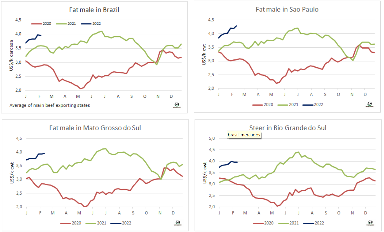 2月前兩周巴西牛肉出口量以驚人的速度增長,價格也穩(wěn)步上漲。外貿(mào)部報告顯示,2月的前9個工作日出口量73446噸,FOB平均價格5504美元/噸。平均每天的出貨量為8161噸,因此如果保持這個速度,2月的出貨量將超過15萬噸,比2021年同月高出50%以上。