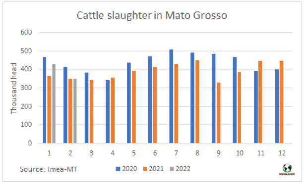 馬托格羅索州是巴西存欄最大的州,2月牛屠宰量和1月相比下降了8.2萬(wàn)頭(-19%),同比也下降了 3000頭,屠宰量連續(xù)三個(gè)月的增長(zhǎng)結(jié)束。Agrifatto稱,屠宰量下降的主要原因是公牛屠宰量較1月份下降了26.6%,只有18.36萬(wàn)頭,是35個(gè)月來(lái)最低。該咨詢公司推測(cè),屠宰量下降可能由于去年9月對(duì)中國(guó)出口暫停以及2021年最后一個(gè)季度待宰牛價(jià)格下降導(dǎo)致育肥進(jìn)程減緩。母牛屠宰量較上月減少8.6%,為16.47萬(wàn)頭,母牛屠宰量在中占比增加到47.3%,為24個(gè)月來(lái)的最高水平。然而這些數(shù)據(jù)本身并不意味著今年待宰牛供應(yīng)增長(zhǎng)趨勢(shì)的逆轉(zhuǎn)。