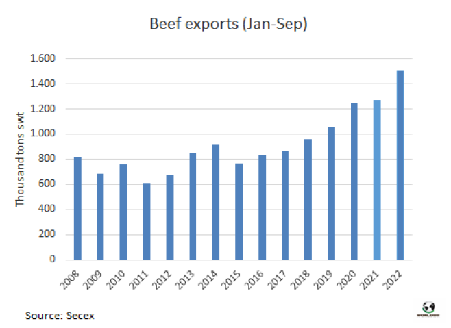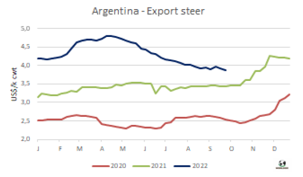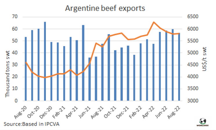 8月阿根廷對中國的出口大幅下降,為4.16萬噸,其中8700噸是帶骨牛肉。冷凍去骨牛肉對中國出口量3.28萬噸,環(huán)比下降20%。中國在阿根廷肉類出口中的份額從上個(gè)月的82%下降到8月份的73%。阿根廷牛肉出口商會(huì)指出:“2022年8月出口到中國的去骨牛肉的平均價(jià)格略高于5500美元/噸,與去年5月的5900美元/噸的峰值相比有明顯下降”。