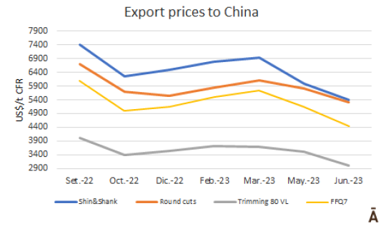 出口到中國的主要產(chǎn)品的參考價格比去年第四季度的最低價還要低5%-15%,相對而言帶骨產(chǎn)品價格則比較穩(wěn)定。